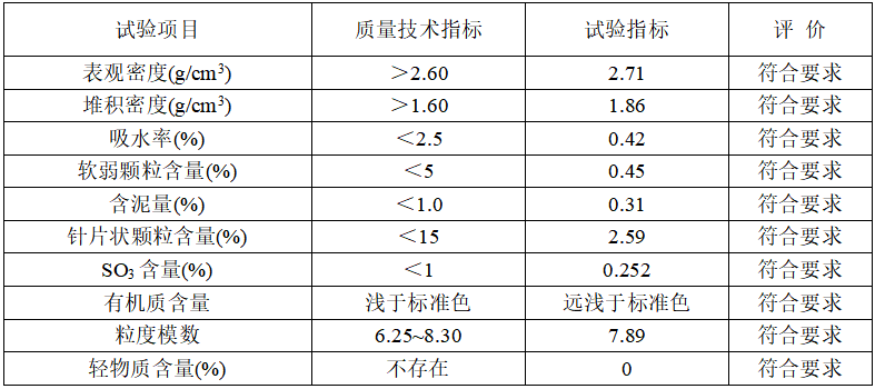 砂卵石粗骨料試驗指標與質量技術要求指標對比表