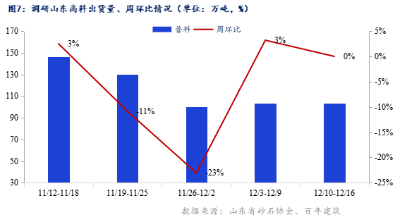 據調研28家大型砂石礦山企業,高料和普料占比為41.4%:58.6%,高標料占比持續回升;本周高料總量約73.1萬噸,周環比增加3%;普料總量約103.4萬噸,周環比持平;重點項目趕工期采購砂石料用量增加,預計下周山東普料、高料需求總量或將持平。