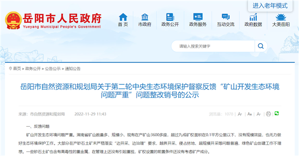 11月底,湖南岳陽市自然資源和規(guī)劃局發(fā)布關(guān)于第二輪中央生態(tài)環(huán)境保護督察反饋“礦山開發(fā)生態(tài)環(huán)境問題嚴(yán)重”整改效果,明確目前已取得階段性成效,達到了問題整改銷號要求。