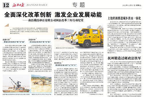 2022年12月27日,江西日報第12版以《全面深化改革創新 激發企業發展動能——南昌贛昌砂石有限公司國企改革三年行動紀實》為題,對南昌贛昌砂石有限公司國企改革三年行動成效進行了報道。