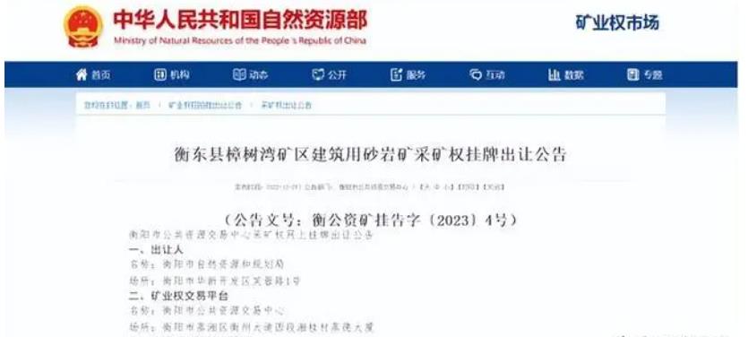 礦區(qū)位于湖南省衡東縣大浦鎮(zhèn)太平村,礦區(qū)面積有0.1006平方千米。開采礦種屬于建筑用砂巖,資源儲量達430.2萬噸。開采標高在+230米至+132米,出讓年限在9.6年,起始價2493.0萬元。申請報名的起止時間在2022年12月26日—2023年01月29日,掛牌時間在2023年01月30日—2023年02月10日。