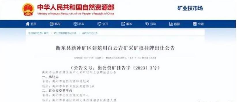 礦區(qū)位于湖南省衡東縣甘溪鎮(zhèn)新沖村,礦區(qū)面積0.116平方千米,開采礦種屬于建筑用白云巖。資源儲量達787.02萬噸,開采標高在+246米至+187米。出讓年限10.8年,起始價3798.33萬元。申請報名的起止時間在2022年12月26日—2023年01月29日日,掛牌時間在2023年01月30日—2023年02月10。