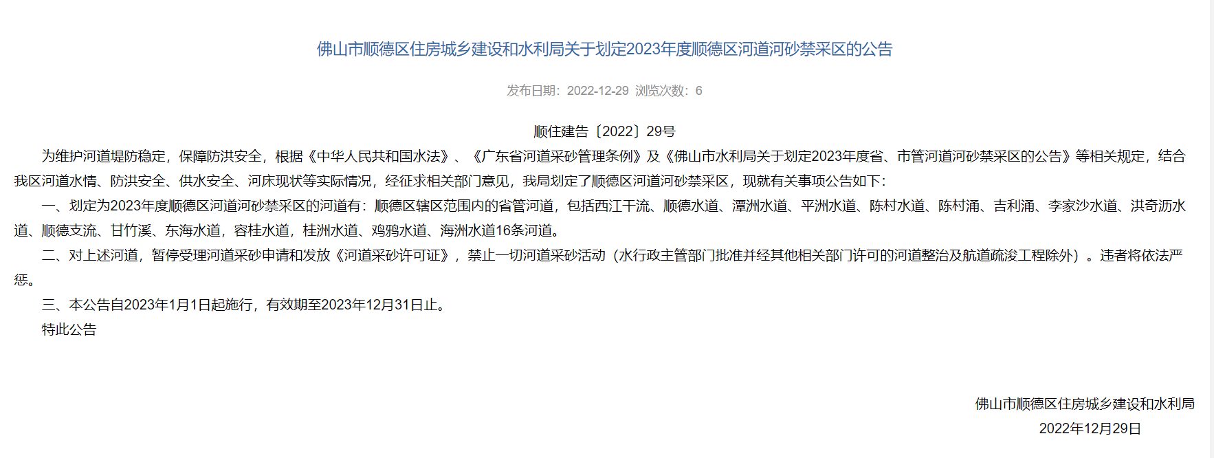 據(jù)悉,為維護(hù)河道堤防穩(wěn)定,保障防洪安全,佛山市順德區(qū)住房城鄉(xiāng)建設(shè)和水利局局劃定了順德區(qū)河道河砂禁采區(qū),自2023年1月1日起施行,有效期至2023年12月31日止。