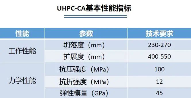 通過摻加粗骨料,減少了漿體體積,達到了低收縮、低徐變、高彈模的性能要求。目前研發(fā)的UHPC-CA超高性能混凝土,主要包含三大技術成果: