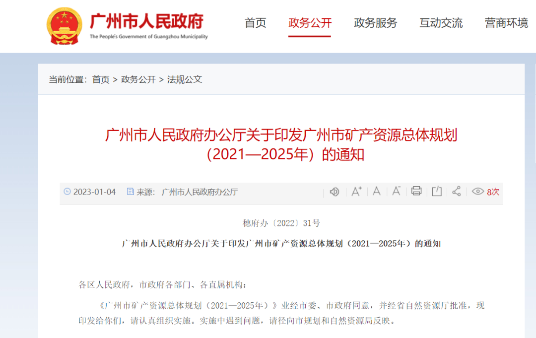 近日,廣州市人民政府辦公廳發布關于印發廣州市礦產資源總體規劃(2021—2025年)的通知。《規劃》是廣州市礦產資源勘查、開發利用與保護的指導性文件,是依法審批和監督管理礦產資源勘查與開發利用活動的重要依據,是加強宏觀調控和礦產資源管理、落實礦業權管理制度的基本手段,是國家規劃體系的重要組成部分。