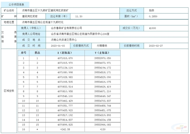 1月3日,山東魯聯礦業有限責任公司以4.1億元拿下濟南市章丘區十九郎礦區建筑用玄武巖礦采礦權。