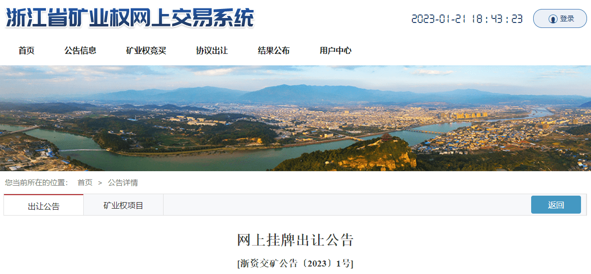 1月19日,浙江省礦業權網上交易系統發布一則建筑用花崗巖礦掛牌出讓公告,該礦資源儲量1461.1萬噸,年生產規模290萬噸,起始價4億元,出讓年限5年。此外,競得人還需一次性支付政策處理費用合計4846.572萬元,掛牌時間2023年2月21日至2023年3月6日。