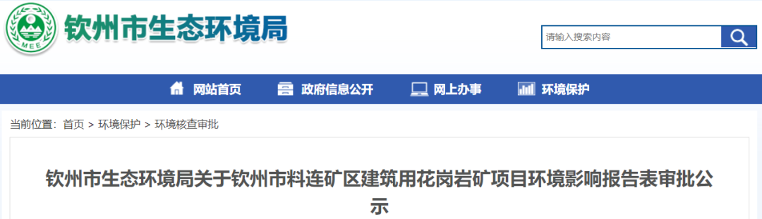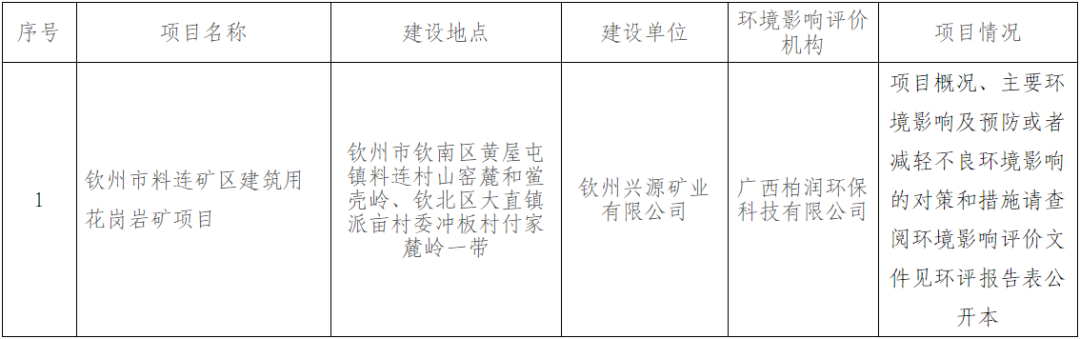 近日,廣西欽州市生態環境局發布《關于欽州市料連礦區建筑用花崗巖礦項目環境影響報告表審批公示》(以下簡稱《公示》)。