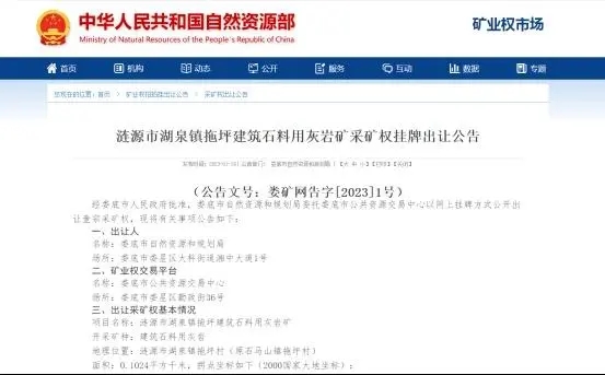 近日,婁底市自然資源和規劃局委托婁底市公共資源交易中心以網上掛牌方式公開出讓漣源市湖泉鎮拖坪建筑石料用灰巖礦采礦權。