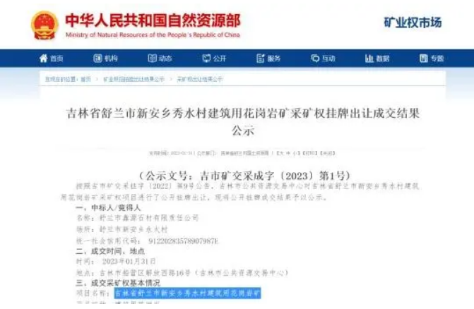 前不久,吉林市公共資源交易中心對吉林省舒蘭市新安鄉秀水村建筑用花崗巖礦采礦權項目進行了公開掛牌出讓。最終舒蘭市鑫源石材有限責任公司以2044.87萬元競得。