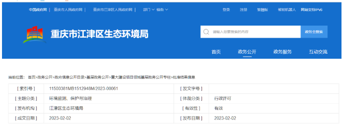 重慶市建設項目環境影響評價文件批準書渝(津)環準〔2023〕18號文件顯示,2022年11月28日,重慶市江津區發展和改革委員會《重慶市企業投資項目備案證》同意該項目備案。