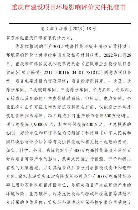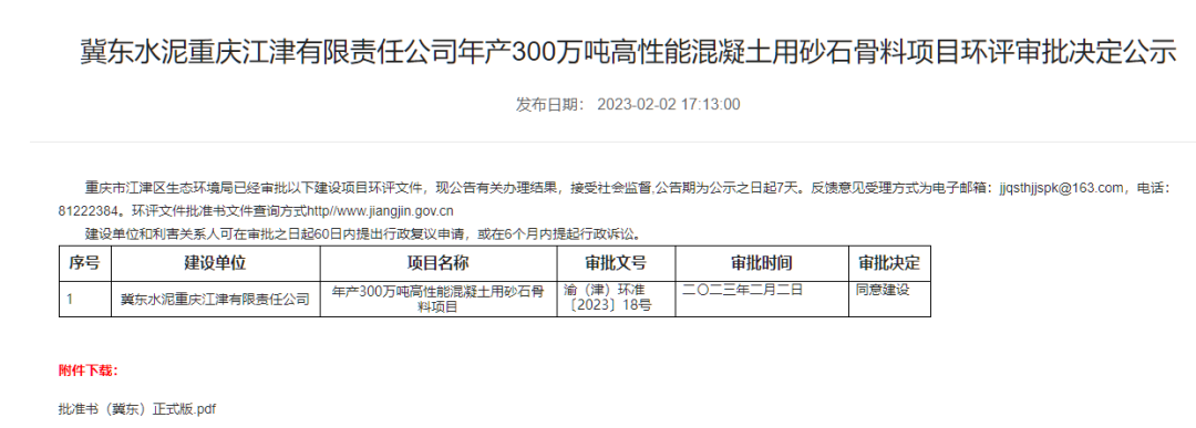 日前,重慶市江津區生態環境局發布《冀東水泥重慶江津有限責任公司年產300萬噸高性能混凝土用砂石骨料項目環評審批決定公示》稱,冀東水泥重慶江津有限責任公司年產300萬噸高性能混凝土用砂石骨料項目于2月2日通過審批同意建設。