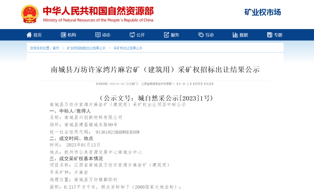 近日,江西省南城縣萬坊許家灣片麻巖礦(建筑用)已成功掛牌出讓,競得該礦權的公司是南城縣興創新材料有限公司。