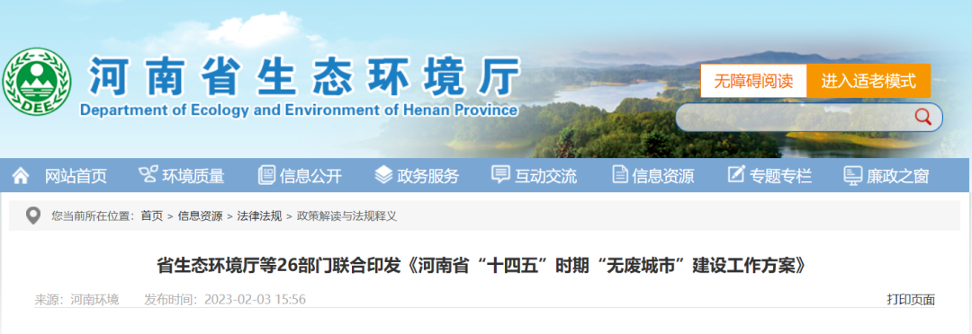 2023年初,河南省生態(tài)環(huán)境廳、河南省發(fā)改委等26部門聯(lián)合印發(fā)了《河南省“十四五”時期“無廢城市”建設(shè)工作方案》(以下簡稱《方案》),以推進固體廢物減量化、資源化、無害化為主線,對全省“無廢城市”建設(shè)進行全面部署。