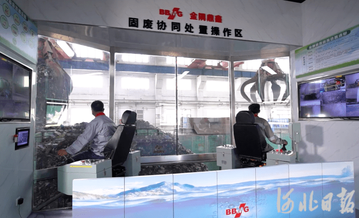 河北金隅鼎鑫水泥有限公司的工作人員在固廢協同處置操作區操作抓斗,將生活垃圾投入板喂機。鹿泉區委宣傳部供圖