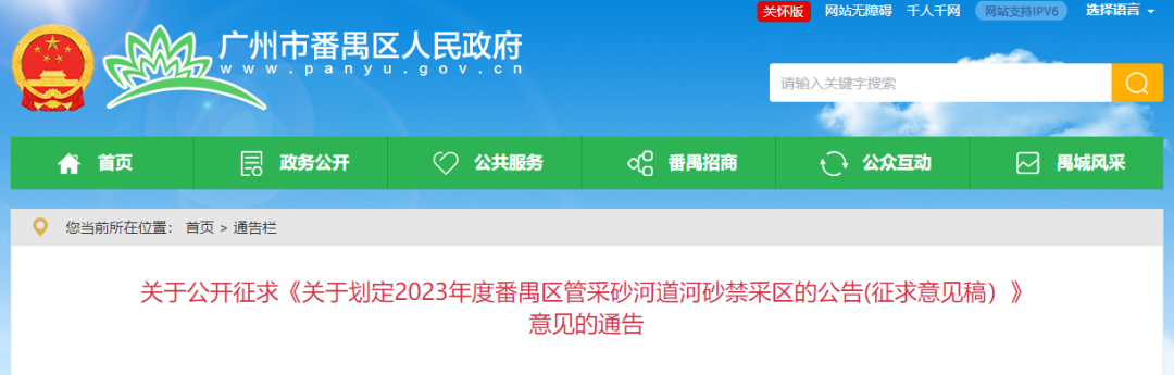 關于公開征求《關于劃定2023年度番禺區管采砂河道河砂禁采區的公告(征求意見稿)》意見的通告