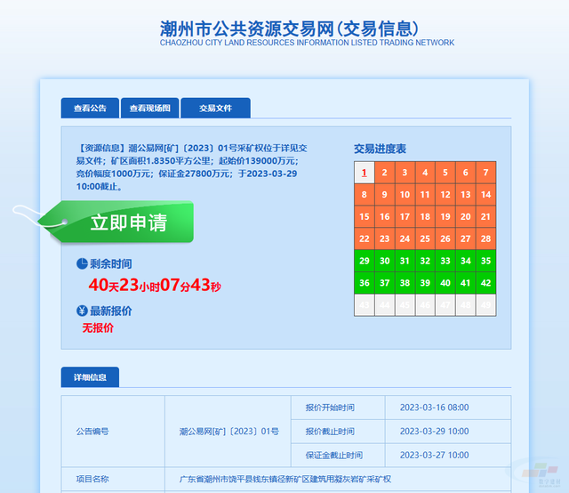 2月16日,潮州市自然資源局發布公告,出讓廣東省潮州市饒平縣錢東鎮徑新礦區建筑用石料(凝灰巖)礦采礦權,擬出讓20年,年產900萬方,起始價13.9億元,增價幅度1000萬元,競買保證金27800萬元。