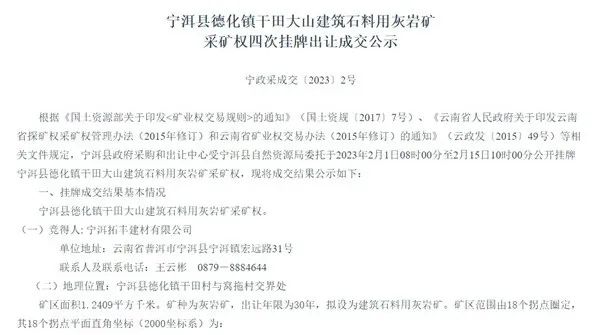 礦最終被當地國企寧洱拓豐建材有限公司以12417.6萬元(約1.24億元)的價格成功競得,且無政策處置費。