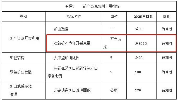 科學調控開采總量,建筑用石料開采規模不低于30萬立方米/年,建筑碎石類礦山開采總量為3000萬立方米/年以上,機制砂開采總量為975萬立方米/年以上,保障城鎮化建設需要。
