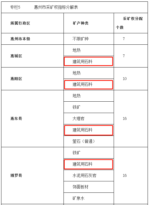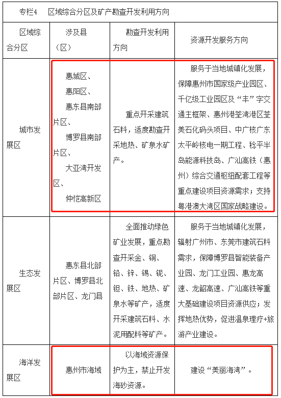 城市發展區適度勘查開采。重點開采建筑用石料,適度勘查開發地熱、礦泉水。發揮地理優勢,充分利用現有的交通網絡,打造粵港澳大灣區建筑石料資源保障支撐點,提升資源保障能力。統籌惠州市轄區內建筑用石料開發大局,現行試點推行大中型建筑用石料開采加工基地建成、開展基地化建設,結合各縣(區)實際,劃定8個建筑用石料集中開采區,總面積為65.57平方千米。