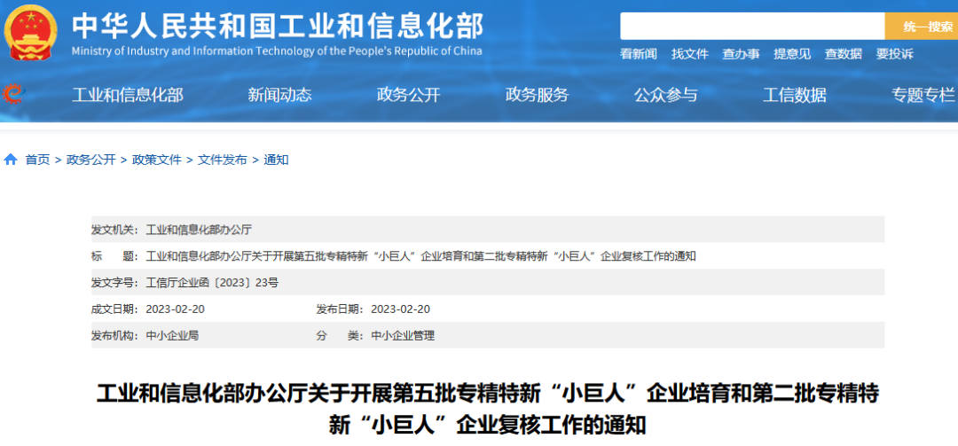 近日,工業和信息化部辦公廳發布《關于開展第五批專精特新“小巨人”企業培育和第二批專精特新“小巨人”企業復核工作的通知》,組織開展第五批專精特新“小巨人”企業培育和第二批專精特新“小巨人”企業復核工作。