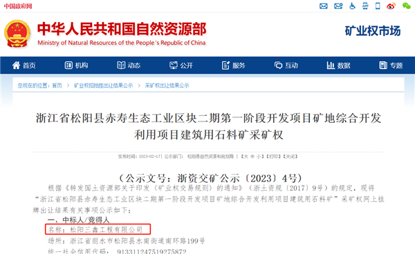 根據公告,此次成交的浙江省松陽縣赤壽生態工業區塊二期第一階段開發項目礦地綜合開發利用項目建筑用石料礦位于松陽縣赤壽生態工業區塊,礦區面積2.37平方千米,其中包含4個機械開采作業區,合計面積約0.66平方千米,開采礦種為建筑用砂巖,由松陽三鑫工程有限公司(隸屬于松陽縣國有資本投資運營集團有限公司)最終摘牌。