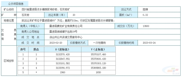 2月20日,四川省涼山州雷波縣汶水鎮顏家灣砂巖、石灰巖礦成功出讓,擬出讓20年,掛牌起始價6700萬元,雷波縣騰宏礦業有限責任公司以1.36億元競得,溢價率102.99%。