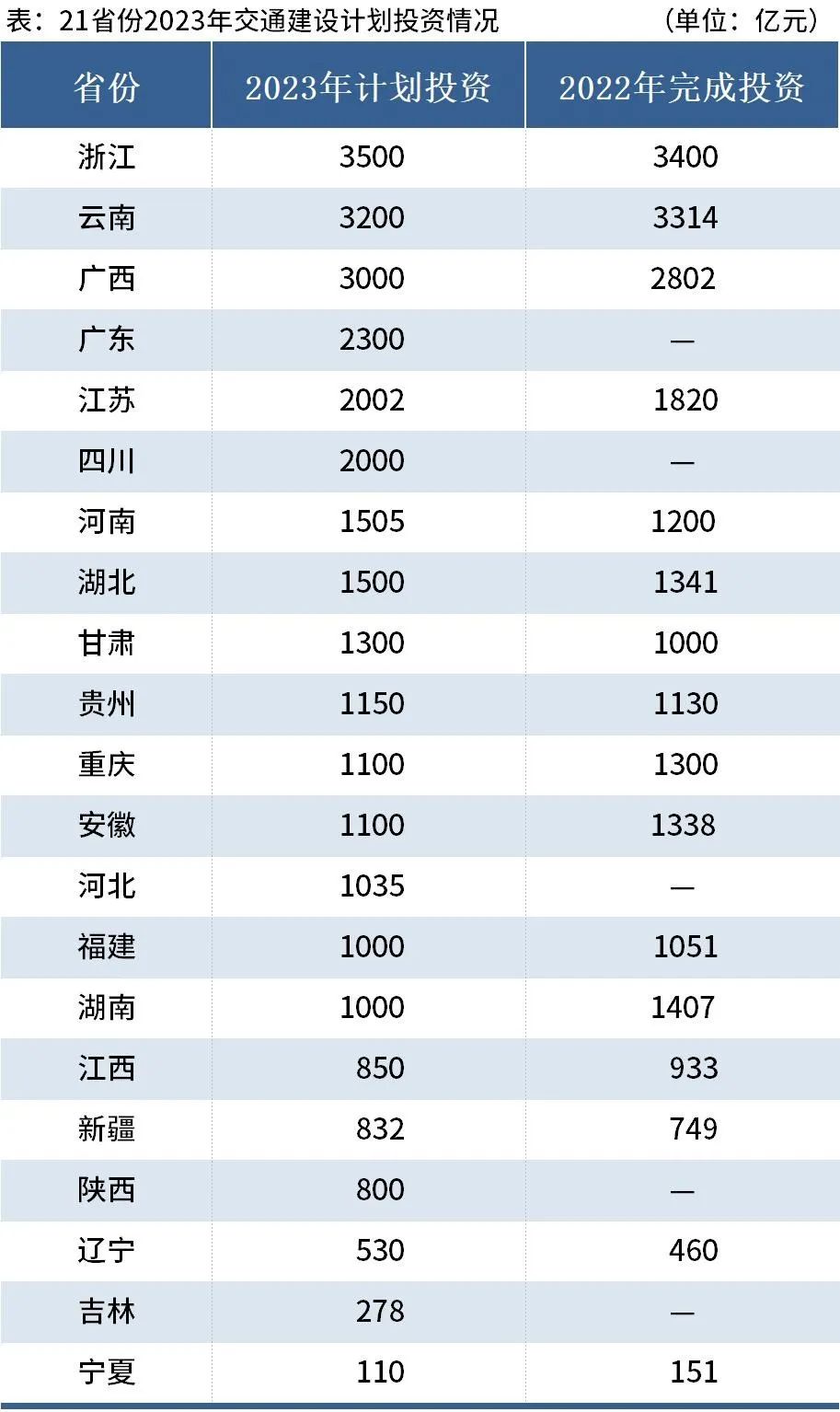 獲悉,2023年,全國交通固定資產投資規模仍將持續加大。這一判斷在多地交通運輸部門近期透露的今年交通投資數據中也得到證實。21省、市發布2023年交通基建投資規劃!打開砂石需求萬億市場!