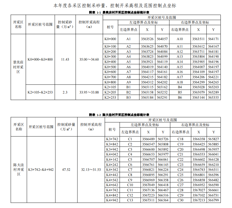 (1)景美店村開采區位于八里岔鄉景美店村附近,竹竿河右岸,分為2段,總長948米,采砂控制量為13.73萬立方米, 其中景美店1號開采區樁號K0+000~K0+800,長800米,控制開采高程為35.00~34.60米,采砂控制量為11.43萬立方米;景美店2號開采區樁號K2+105~K2+253,長148米,控制開采高程為33.95-33.88米,采砂控制量為2.30萬立方米。
