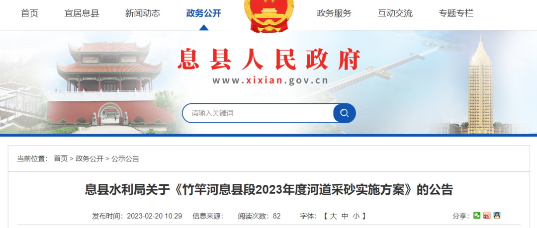 為規范息縣河道采砂秩序,建立健全河道采砂長效機制,確保息縣河道采砂“依法、規范、科學、有序”開展。根據《信陽市河道采砂管理條例》《河南省水利廳關于進一步推進河道采砂管理規范化制度化的意見》(豫水河(2021)3號)等有關法律法規文件規定,按照《信陽市水利局關于竹竿河息縣段河道采砂規劃(2022-2023年)的批復》(信水河〔2022〕11號)要求,息縣水利局委托中庚工程技術有限公司編制完成《竹竿河息縣段2023年度河道采砂實施方案》,并于2023年2月14日獲信陽市水利局(信水河〔2023〕5號)審查批復。現將《竹竿河息縣段2023年度河道采砂實施方案》主要內容公告如下: