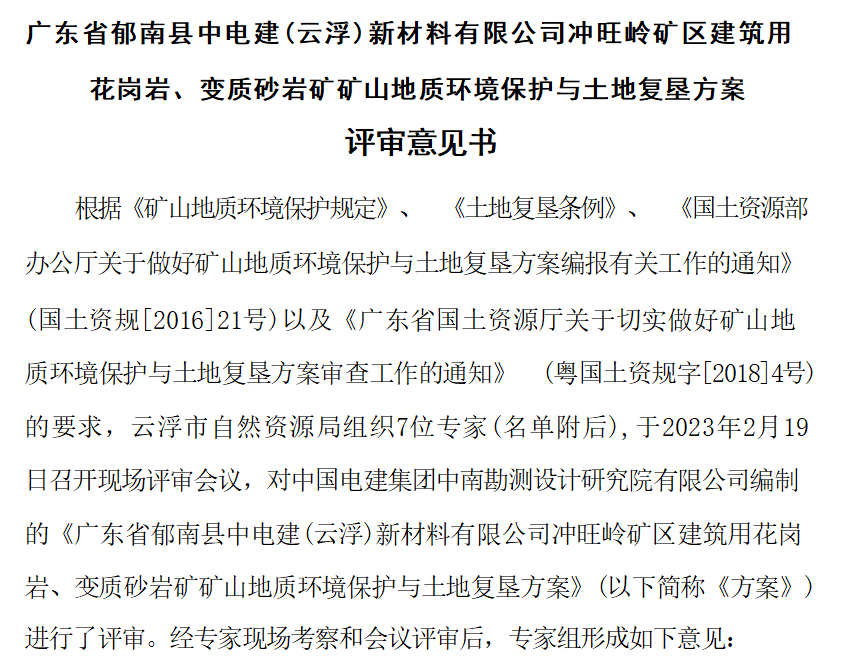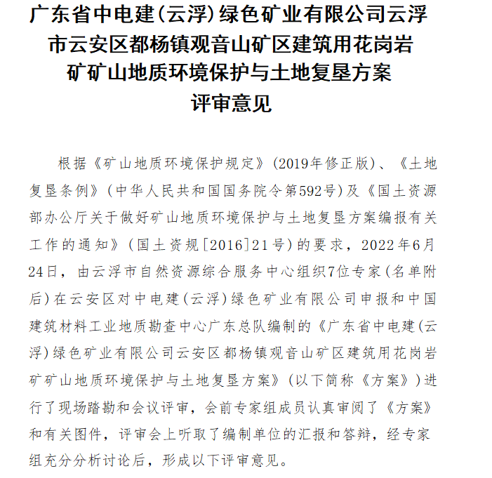 廣東省中電建(云浮)綠色礦業有限公司云浮市云安區都楊鎮觀音山礦區建筑用花崗巖礦礦山地質環境保護與土地復墾方案評審意見