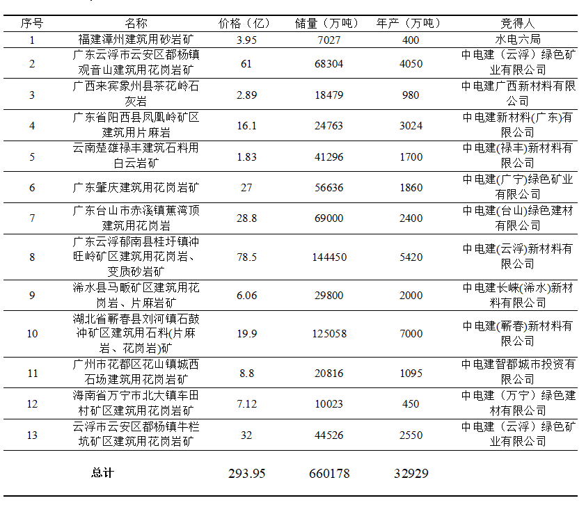 據了解,中電建(云浮)新材料有限公司以78.5億元底價郁南縣桂圩鎮沖旺嶺礦區建筑用花崗巖、變質砂巖礦權,該項目由中電建(云浮)新材料有限公司投資建設,礦區范圍內確定的建筑用石料礦體開采儲量46375.88萬立方米。項目總投資174.6億元,設計生產能力2000萬m? /a(5420萬噸/年)。