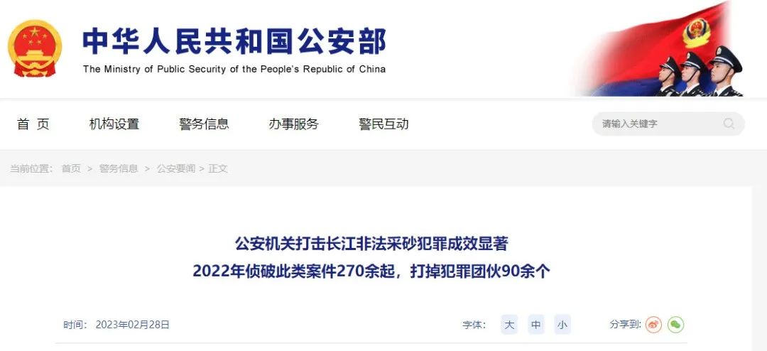 據悉,2022年公安部組織上海、江蘇、浙江、安徽、江西、湖北、湖南、重慶、四川、貴州、云南等長江流域11省(市)和長江航運公安機關深入開展打擊長江非法采砂犯罪專項行動。