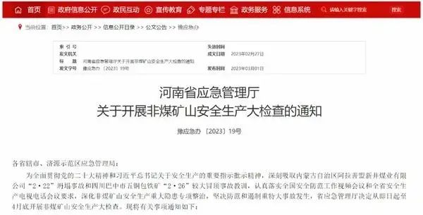 3月1日,河南省應急管理廳網站發布《關于開展非煤礦山安全生產大檢查的通知》,從即日起至4月底,分三個階段在全省范圍內開展非煤礦山安全生產大檢查,堅決防范和遏制重特大事故發生。
