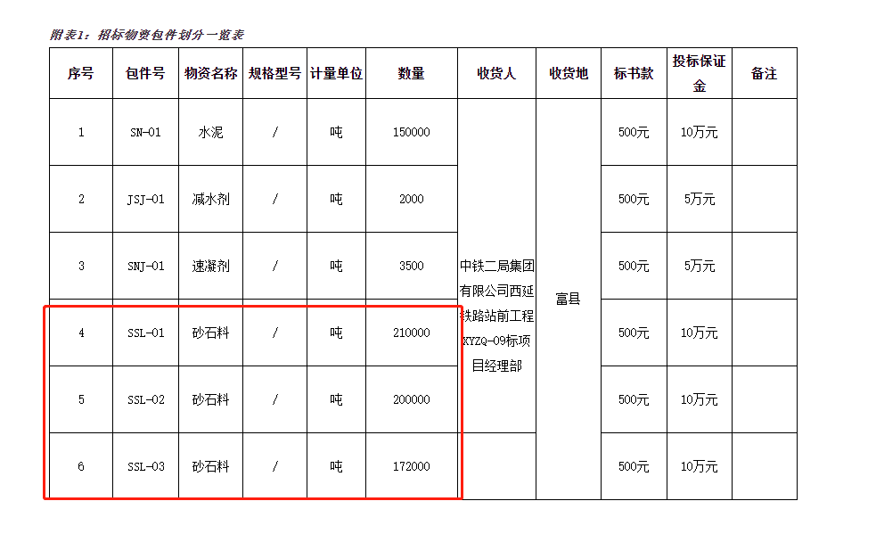 項(xiàng)目為中鐵二局集團(tuán)有限公司西延鐵路站前工程XYZQ-9標(biāo)砂石料招標(biāo),招標(biāo)人為中鐵二局集團(tuán)有限公司西延鐵路站前工程XYZQ-9標(biāo)項(xiàng)目經(jīng)理部,招標(biāo)項(xiàng)目資金來(lái)源為政府資金,出資比例為100%。該項(xiàng)目已具備招標(biāo)條件,現(xiàn)對(duì)砂石料采購(gòu)進(jìn)行公開(kāi)招標(biāo)。