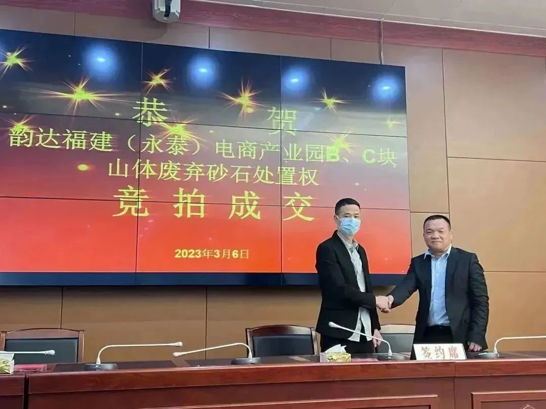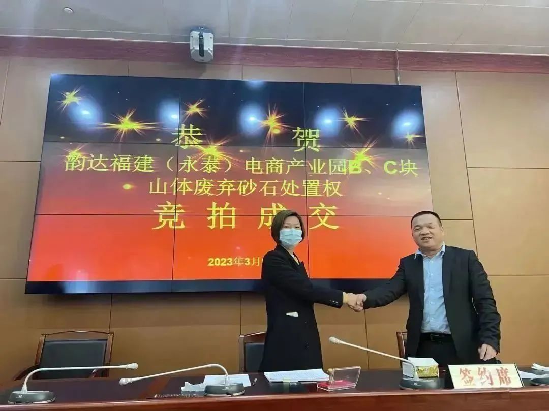 本次拍賣標的物為韻達福建(永泰)電商產業園B、C塊山體廢棄砂石處置權,涉及的砂石土總量約為220.4萬m?,其中可利用加工生產為建筑用石料的儲量為163.06萬m?,起拍價2220萬元。現場競拍激烈,經386輪競價,最終由83號競買人永泰縣筑誠機制砂有限公司以7060萬元最高報價競得。