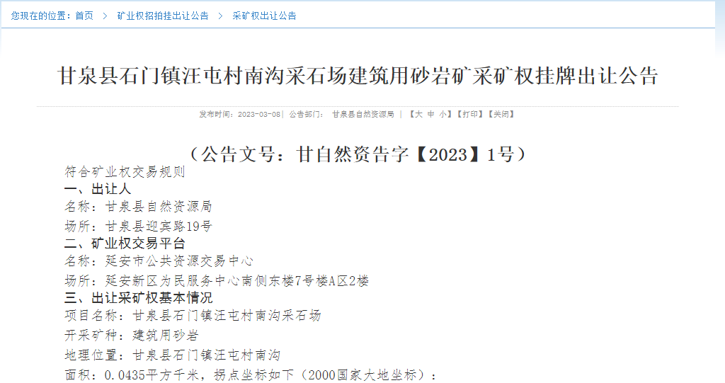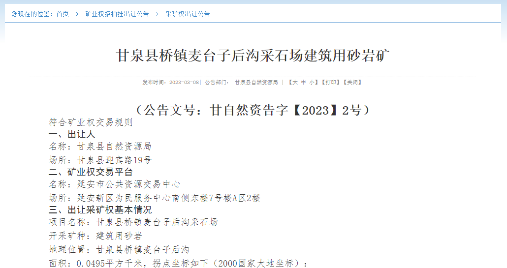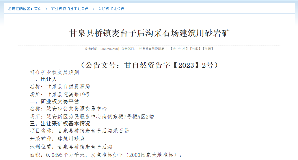 據悉,陜西省延安市甘泉縣自然資源局以網上公開掛牌交易方式出讓3宗建筑用砂巖采礦權。據估算,3宗礦權資源儲量共計近1500萬噸,起始價共計近2800萬元。