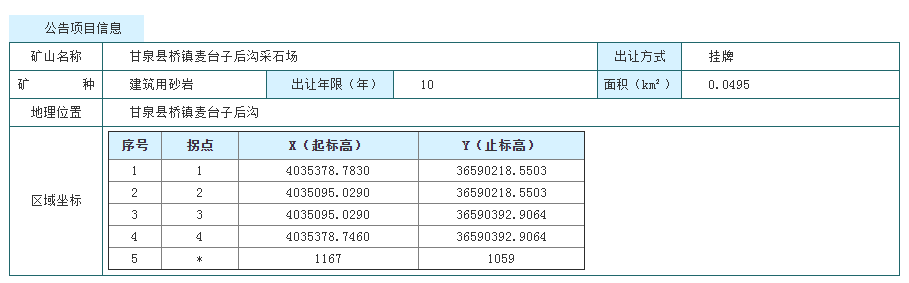1、甘泉縣石門鎮汪屯村南溝采石場建筑用砂巖礦采礦權,資源儲量211.49萬噸,面積0.0435平方千米,擬出讓年限9年,起始價420萬元;2、甘泉縣石門鎮白渠村白渠溝采石場建筑用砂巖礦,資源儲量933.87萬噸,面積0.1721平方千米,擬出讓年限10年,起始價1800萬元;3、甘泉縣橋鎮麥臺子后溝采石場建筑用砂巖礦,資源儲量339.63萬噸,面積0.0495平方千米,擬出讓年限10年,起始價578萬元。