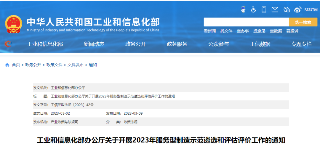 2023年3月9日,工業和信息化部辦公廳發布《關于開展2023年服務型制造示范遴選和評估評價工作的通知》(以下簡稱《通知》)。《通知》部署開展第五批服務型制造示范遴選工作。