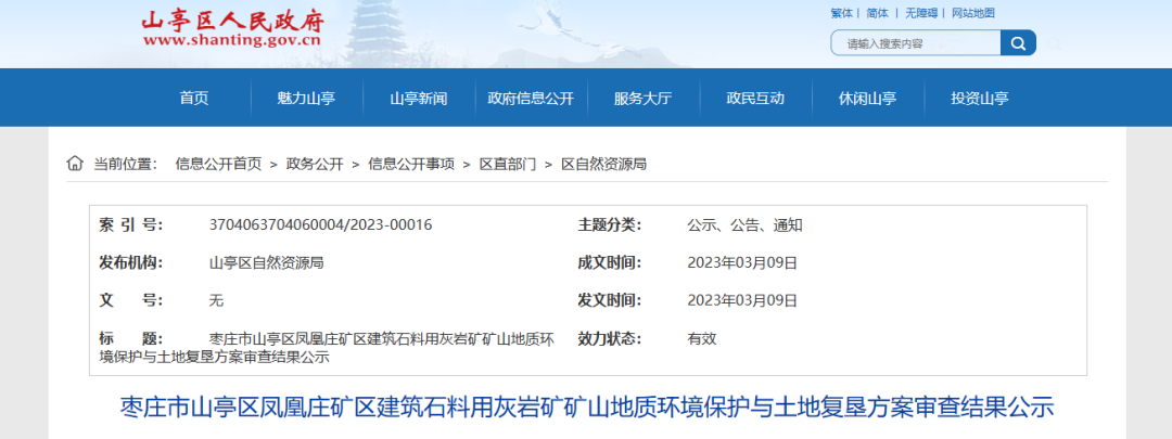2023年3月9日,山東省棗莊市山亭區鳳凰莊礦區年產1150萬噸建筑石料用灰巖礦地質環境保護與土地復墾方案通過評審。