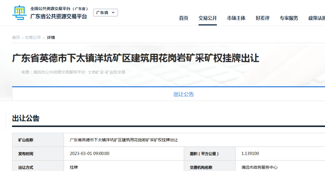 近日,清遠市公共資源交易中心以網上掛牌出讓廣東省英德市下太鎮洋坑礦區建筑用花崗巖礦。