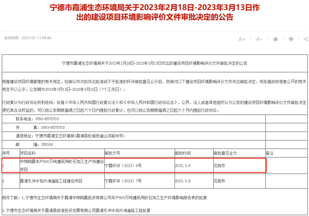 近日,福建省寧德市霞浦生態環境局發布中燁朗晨年產600萬噸建筑用砂石加工生產線建設項目環境影響評價文件審批決定的公告。