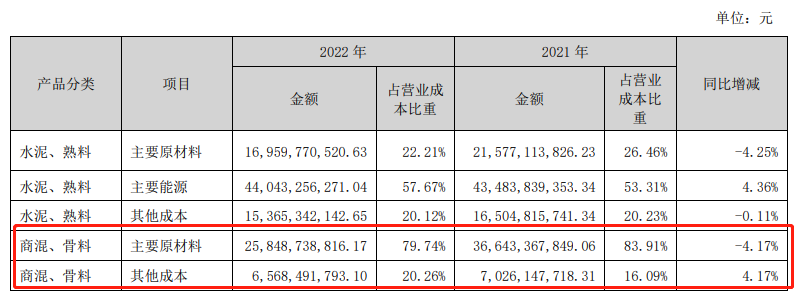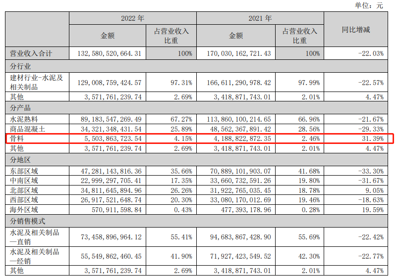 據悉,天山股份3月21日晚間披露年報,2022年度,天山股份營業收入 1325.81億元,其中水泥銷售收入891.84億元,占營業收入總額67.27%,商品混凝土銷售收入343.21億元,占營業收入總額的25.89%,骨料銷售收入55.04億元,占營業收入總額的4.15%。