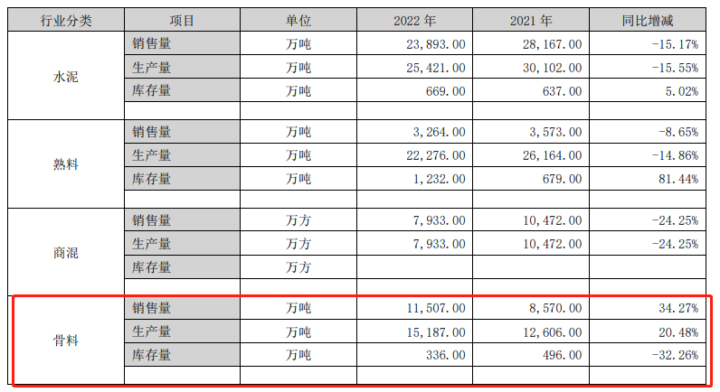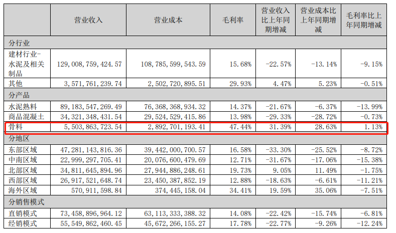 截止本報告期末,公司擁有骨料產能2.3億噸,產量1.5億噸。報告期內,公司骨料產能增加,銷量同比增加34.27%,毛利率同比微增,效益同比增長;水泥需求大幅下降,價格不斷下行,公司整體業績同比大幅下滑。