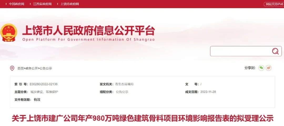 據悉,2022年12月12日,江西省上饒市人民政府對上饒市建廣綠色建筑材料有限公司年產980萬噸綠色建筑骨料項目環境影響報告表予以批準公示。