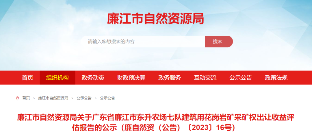 據悉,廣東省海豐縣自然資源局及廉江市自然資源局發布平東鎮坑口村尖筆山(虎地腳)石場、黃羌鎮黃羌村委鐘屋地石場、河東村委上頭洋村矮尖山石場、廉江市東升農場七隊建筑用花崗巖礦等4個新立石場采礦權出讓收益評估結果的公示。