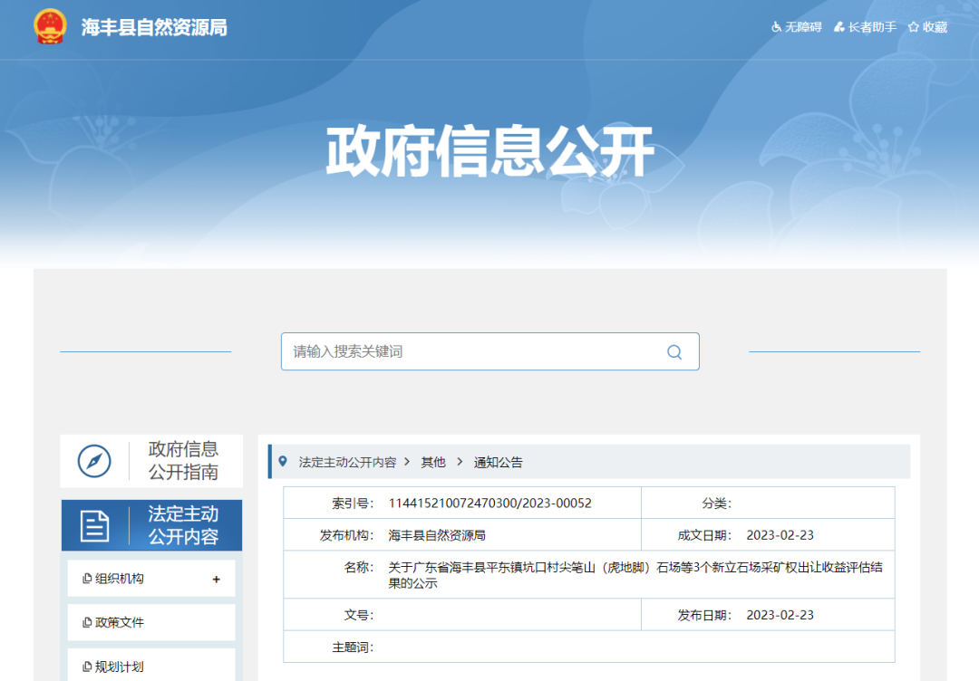海豐縣自然資源局根據有關規定,在官方網站對3個新設立石場的收益評估及主要參數進行信息公開。3個石場經濟價值約43000萬元,礦山企業投產后,可在一定程度緩解地區建筑用石料供需難題,并可向當地社會提供一些就業機會,提高當地人民的生活水平,為國家和地方財政帶來一定的收益,具有較好的經濟效益和社會效益。