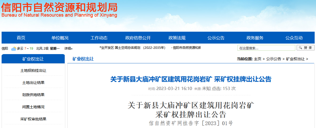 3月21日,河南省信陽市自然資源局公開出讓新縣大廟沖礦區建筑用花崗巖礦,開采礦種為建筑石料用花崗巖,資源儲量8061.20萬噸,生產規模500萬噸/年,擬出讓年限為13年零6個月(不含基建期),起拍價20063.86萬元,據估算均價約為2.5元/噸。