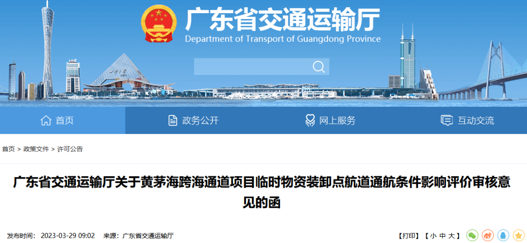 近日,廣東省交通運輸廳發布《關于黃茅海跨海通道項目臨時物資裝卸點航道通航條件影響評價審核意見的函》(以下簡稱《審核意見》)。