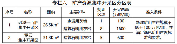(2)羅云集中開采區:位于涪陵東部,主要涉及羅云鎮,面積31.3平方公里,區內現有建筑石料用灰巖采礦權開采區塊4個。規劃期內擬調整采礦權開采區塊1個、新設1個,預設建設石料用石灰巖礦生產規模600萬噸/年。